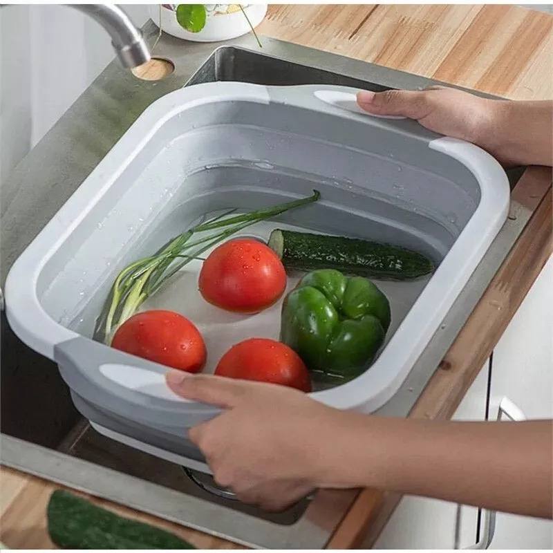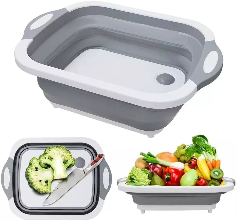 Nuestra TABLA PARA PICAR es plegable y fácil de usar Cuenta con un botón de drenaje para lavar y escurrir tus verduras